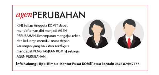 KOMIT (Koperasi Mitra Teladan) memberikan kesempatan sebesar-besarnya untuk anggota KOMIT untuk bergabung menjadi Agen Perubahan.